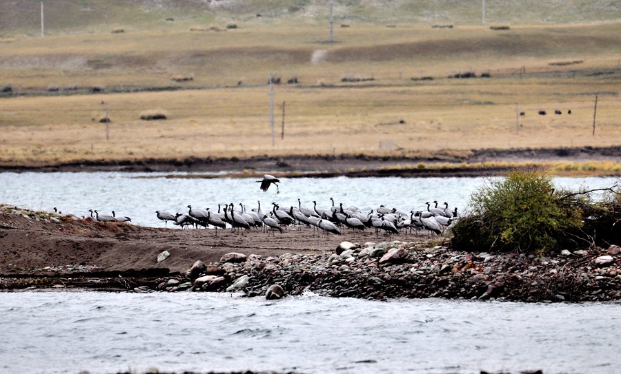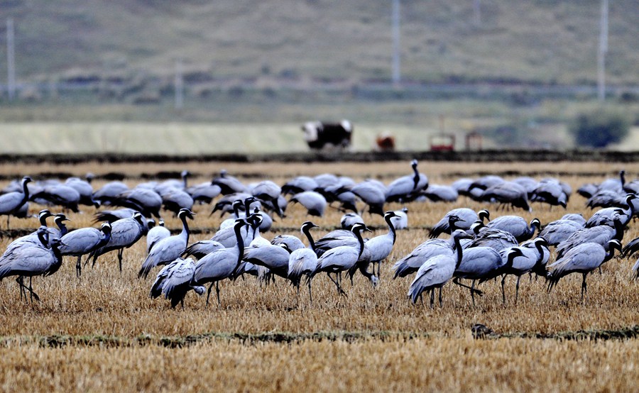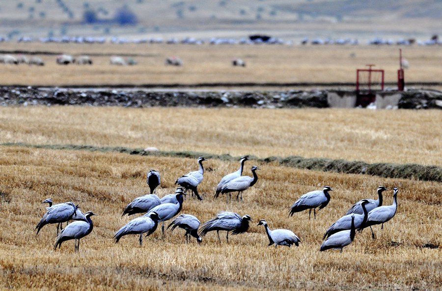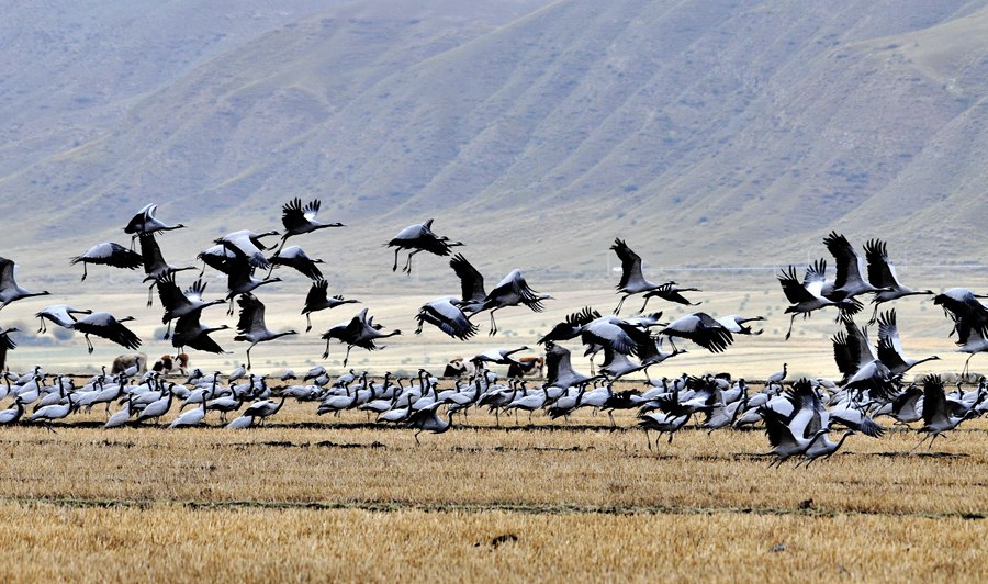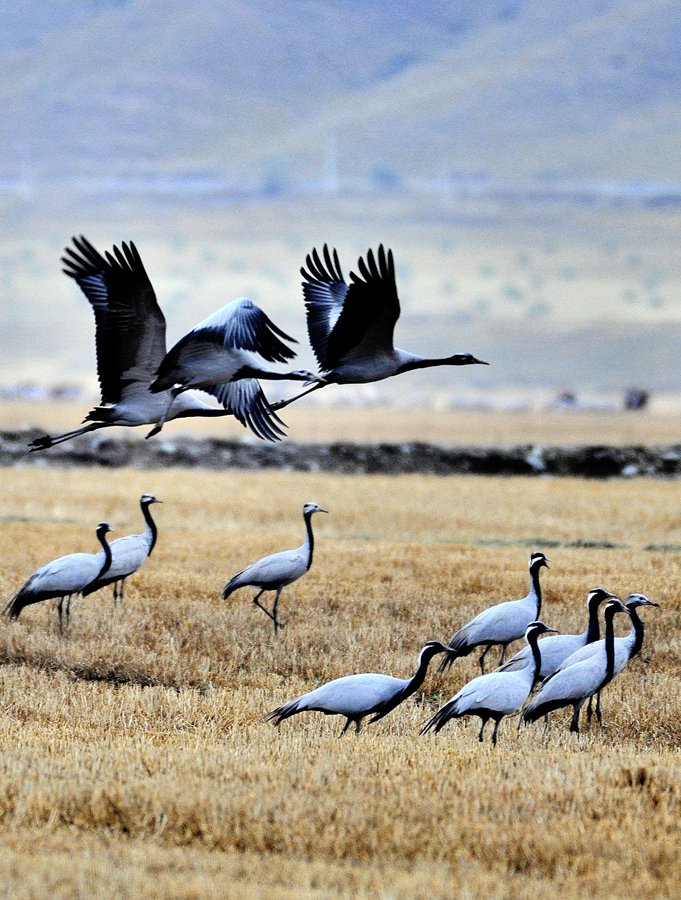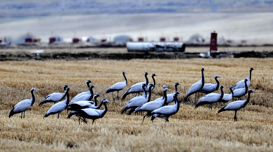 人民网兰州10月10日电 (记者高翔)寒露至、候鸟迁,甘肃省肃南裕固族自治县皇城镇夏日塔拉草原迎来数千只蓑羽鹤,它们在湿地的水面上、草丛中或悠闲觅食、或蹁跹起舞,与色彩斑斓的草原构成了一幅和谐优美的生态画卷。
