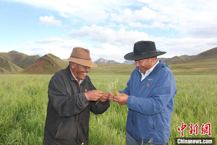 资料图为玉树市上拉秀乡干部查看燕麦试种情况。玉树市委宣传部供图