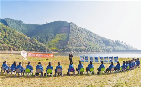 立冬后,位于浙江省长兴县泗安镇的长潮水库迎来了今年首批候鸟。近日,长兴县人民法院、长兴县自然资源和规划局、森林公安等部门受学校邀请为孩子们开展“守护候鸟迁徙地,保护生物多样性”主题活动。孩子们在现场写生画下候鸟,法官为孩子们讲解相关法律知识,提升孩子们保护候鸟和迁徙地环境的意识。图为法官为孩子们讲解候鸟迁徙常识及鸟类保护法律知识。