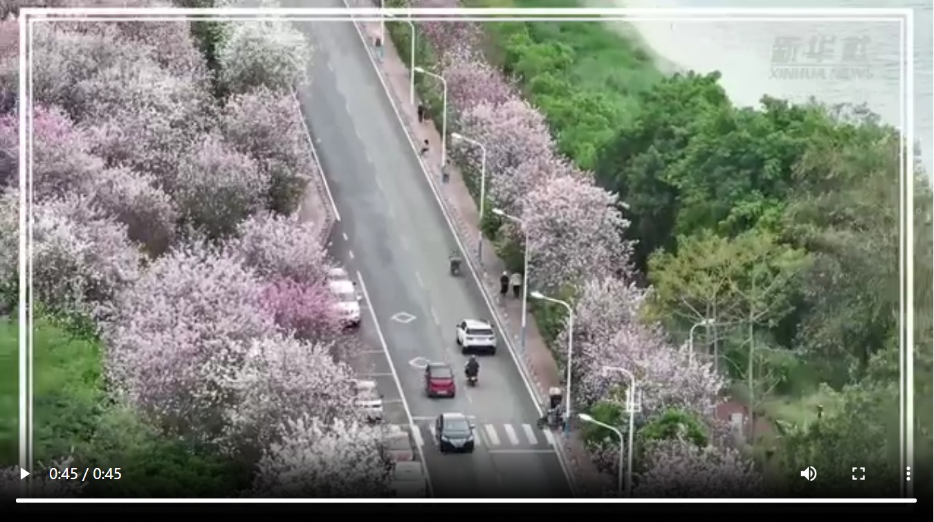 近日,广西柳州市市区近30万株洋紫荆进入盛花期,市区近百条街道和多个公园、小区逐渐变成花的海洋。粉色的花海与城市公路相互映衬,构成一幅美丽的春日画卷。