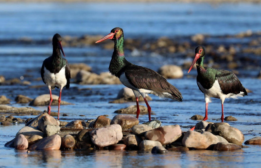 近日,近百只黑鹳飞抵河北省井陉县绵蔓河一带栖息越冬。黑鹳是世界濒危珍禽,属国家一级重点保护野生动物,因数量稀少,被称为“鸟中大熊猫”。近年来,井陉县持续推进生态环境治理,维护河湖生态平衡,吸引许多珍稀鸟类前来栖息。新华社记者 杨世尧 摄