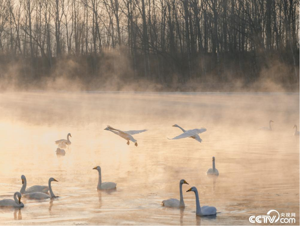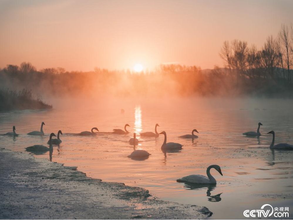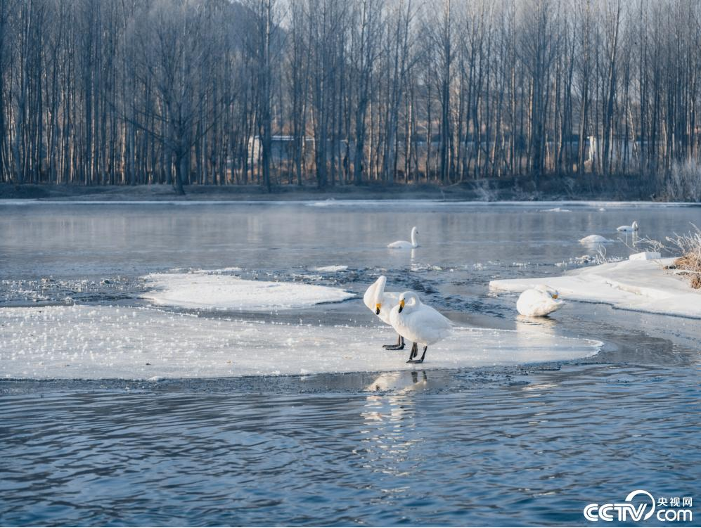 辽宁朝阳:天鹅集聚红村天鹅湾越冬
