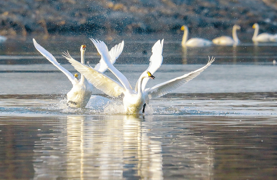 2022年12月15日,在山西洪洞汾河国家湿地公园,白天鹅在水中游弋嬉戏。临汾市在落实海绵城市理念、推进海绵城市建设以来,以汾河流域生态修复为抓手,汾河水生态大幅改变,生态宜居的“海绵体”不仅成为市民生活的康养氧吧,也为过冬迁徙的候鸟提供了高品质的栖息环境,成为冬日河畔一道最美的风景线。