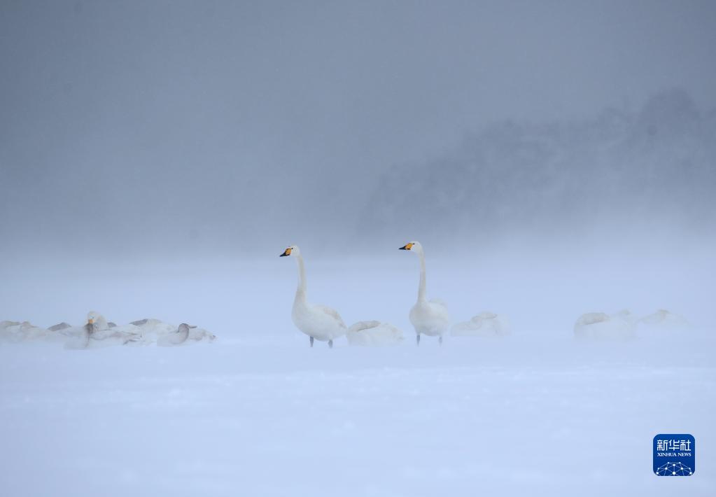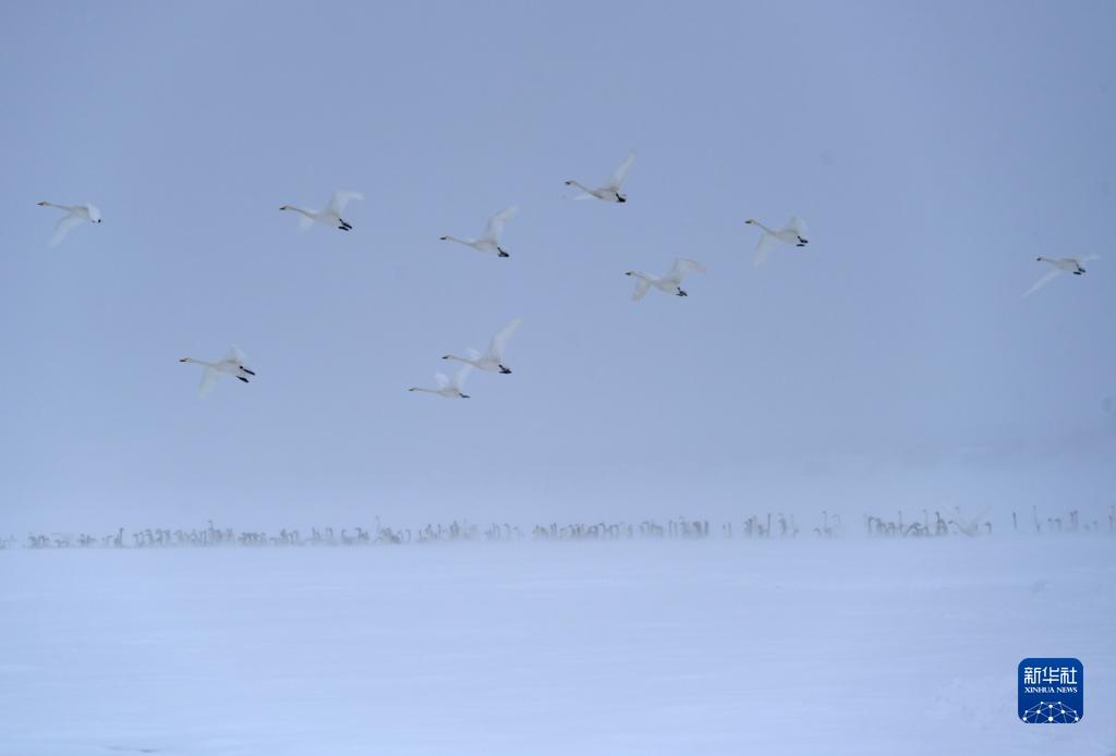 近日,山东荣成出现降雪。在荣成天鹅湖,大天鹅迎风戏雪,翩翩起舞。