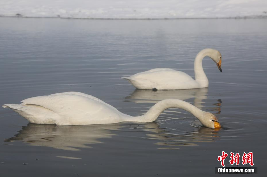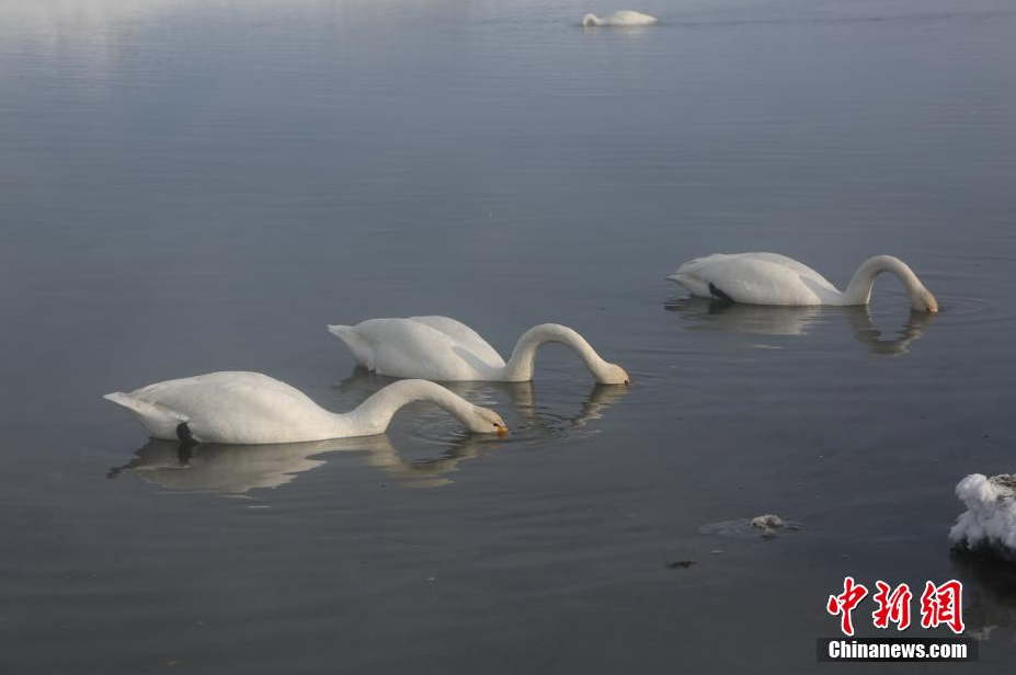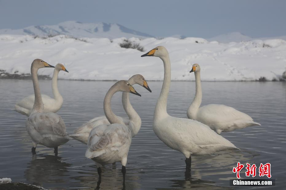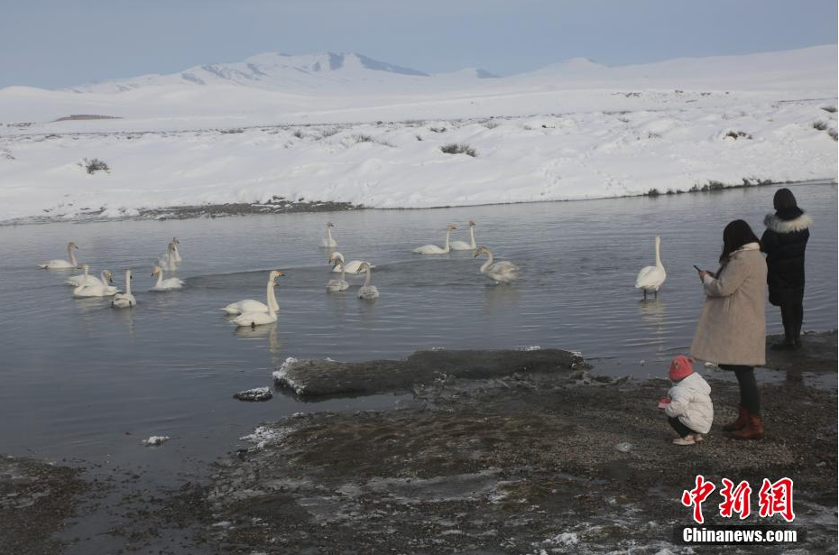 早春时节,河流冰雪慢慢融化,新疆昭苏县湿地越冬的野生天鹅在暖阳下觅食、游弋,和周围皑皑白雪交织成一幅自然和谐的春日美丽画卷。近年来,随着昭苏县生态环境的改善和人们对野生动物保护意识的不断增强,到昭苏县湿地越冬的天鹅越来越多,一般于每年11月中旬飞来,次年4月中旬前飞离。图为天鹅成为湿地的一道独特风景,每天都吸引游客观看、喂食。