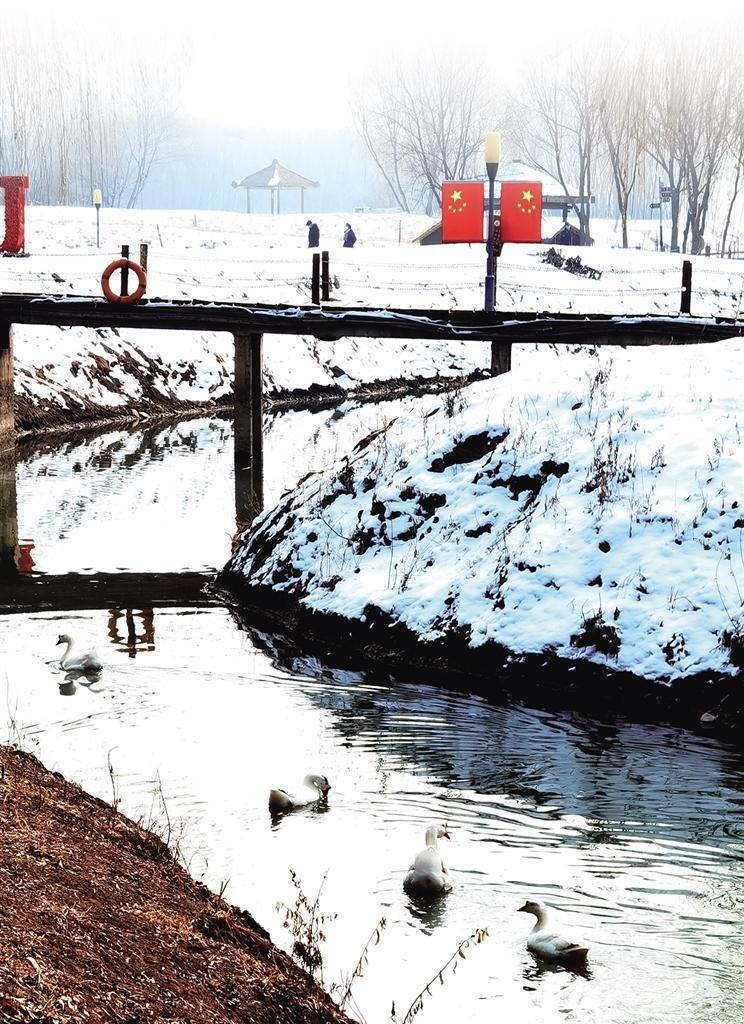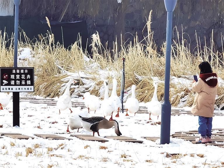 前几日一场瑞雪,银滩湿地内银装素裹。记者午后采访时看到,一湖碧水静如明镜,数十只鸳鸯有的相拥一起享受着阳光,有的则在湖中央游来游去。木质栈道上的积雪已被清扫,蜿蜒着向东西方向延伸。一群家鹅悠闲地在不远处欢叫,几处凉亭、三五名游客……雪中的湿地显得格外安宁、祥和。