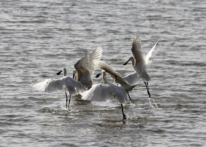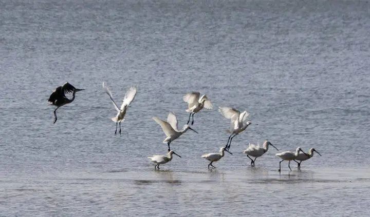黑脸琵鹭属于鹳形目、鹮科、琵鹭亚科,羽毛白色,脸与喙为黑色,因其扁平状的长嘴与琵琶极为相似,因而得名。黑脸琵鹭喜在水面平静且浅的泥泞水塘、湖泊或泥滩活动,因其姿态优雅,也被称为“黑面天使”或“黑面舞者”。黑脸琵鹭对栖息地要求较高,近年来,随着台安柳河生态环境改善,越来越多的鹭鸟回归,候鸟到此停栖。这些黑面琵鹭时而娴静而立,时而悠闲觅食,时而起舞求欢,飞行时颈部和腿部伸直,有节奏地缓慢拍打着翅膀,姿态优美而平缓,在空中留下优雅的身影。
