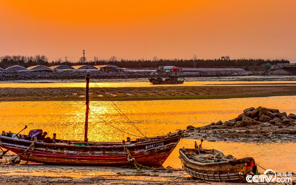 山东日照:晚霞渲染傅疃河口 水面渔船荡漾海鸟飞翔