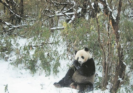 另一处点位也拍摄到了大熊猫觅食的影像,只见画面中这只大熊猫坐在红外相机前的雪地里,握着一截竹枝,慢悠悠咬一口便仰头咀嚼,好不安逸。