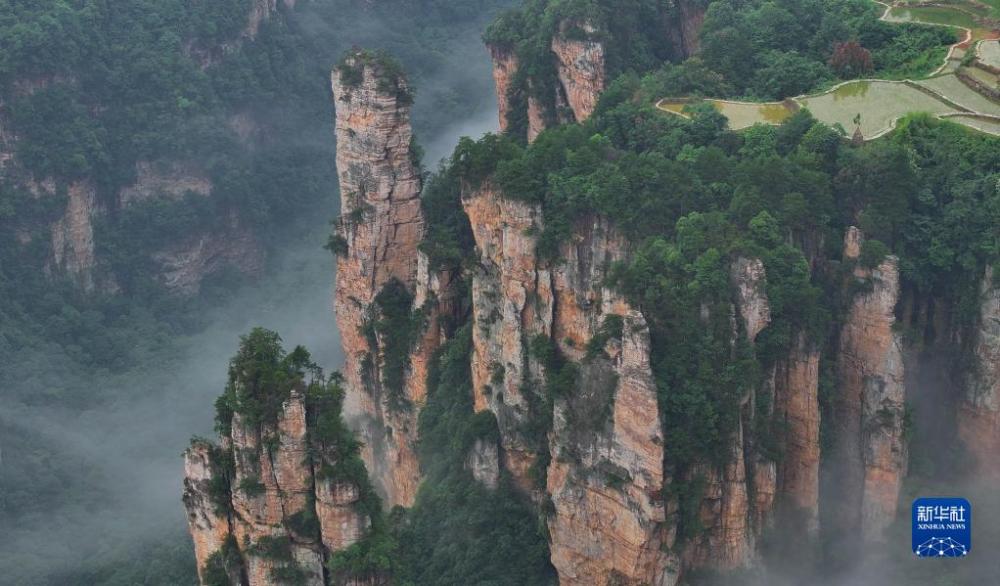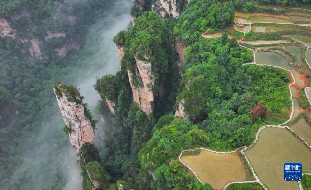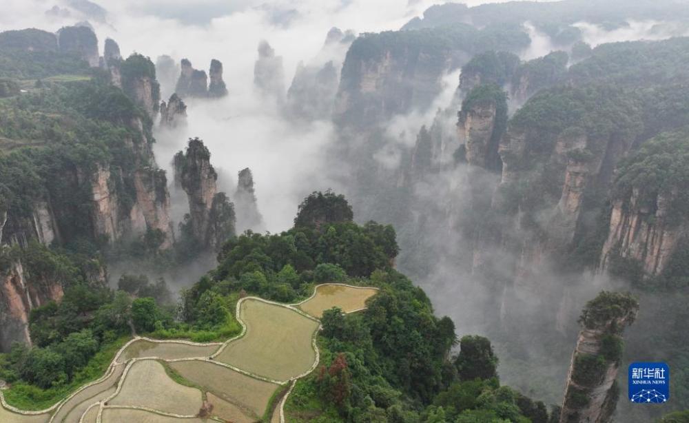 近日,湖南张家界迎来连续降雨。雨后,云雾在连绵耸立的峰林间飘荡,悬崖峭壁之上的农田在云雾中若隐若现,构成一幅幅独特的生态画卷。 新华社发(吴勇兵摄)