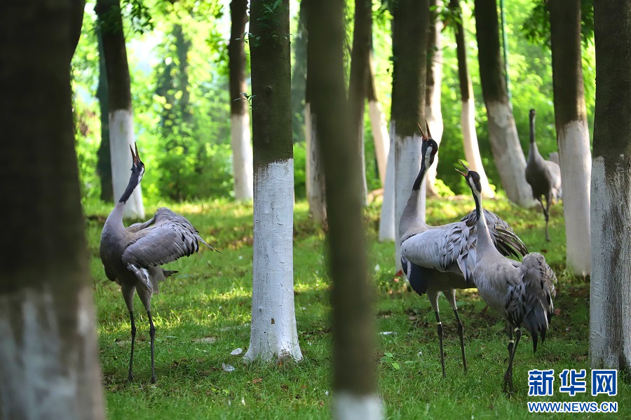 在艾溪湖湿地公园鹤园,两只刚满月的蓑羽鹤宝宝在亲鸟的陪同下到林下草地嬉戏觅食。5个月后,它们就将“成年”。“这两只蓑羽鹤宝宝经过28天的孵化期,分别在5月16日、18日出生,它们有四个哥哥姐姐。”艾溪湖湿地公园工作人员王菁介绍。公园通过营造良好的环境帮助候鸟自然孵化,增强对外界环境的适应能力。