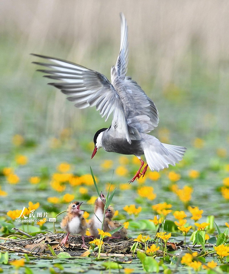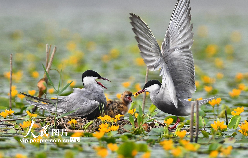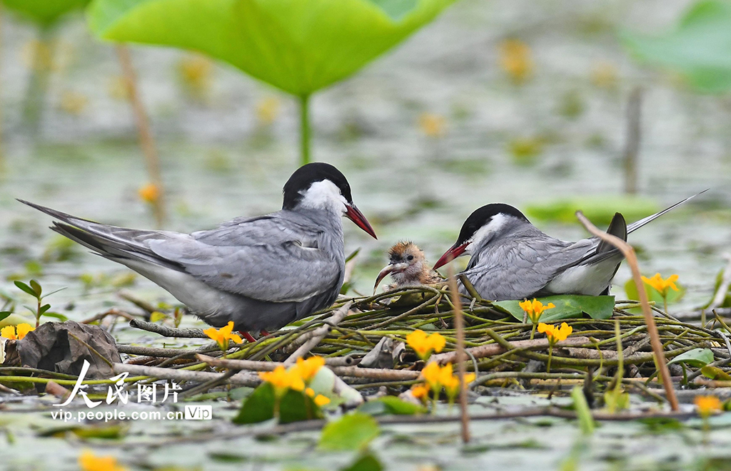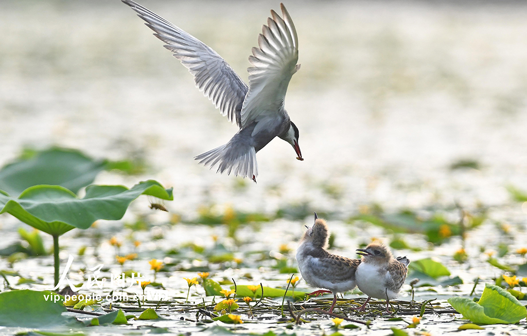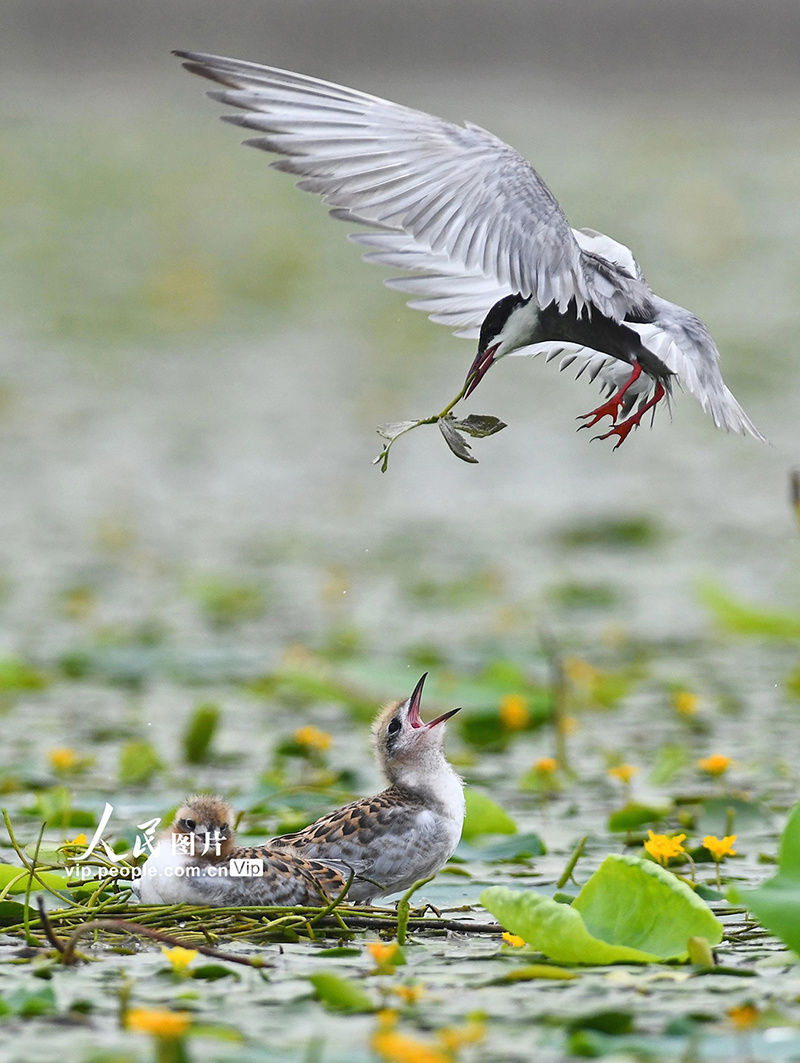 2023年7月23日,山东省泰安市东平县须浮鸥在哺育幼鸟。李志军摄(人民图片网)