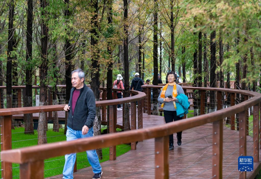 10月25日,游客在宝丰半岛湿地森林栈道游览。