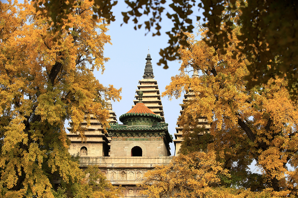 北京:五塔寺百岁银杏满树金黄 与巍峨古塔交相辉映